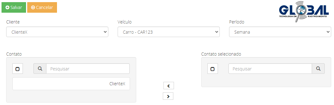 Após clicar no botão "Adicionar", você será redirecionado para a guia de cadastro de agendamento. Nela, selecione um cliente e ativo já cadastrados e habilite os contatos para o recebimento do relatório de monitoramento.