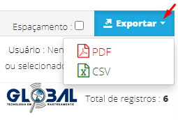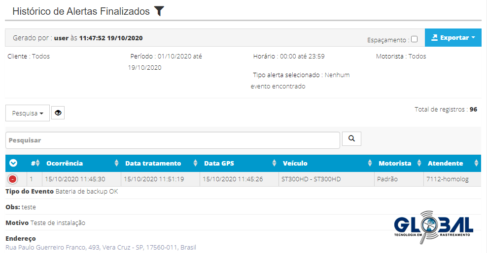 Na guia Histórico de alertas finalizados, para obter o relatório como um arquivo, pressione o botão "Exportar" e selecione o formato desejado (PDF ou CSV). O download do arquivo será realizado automaticamente.