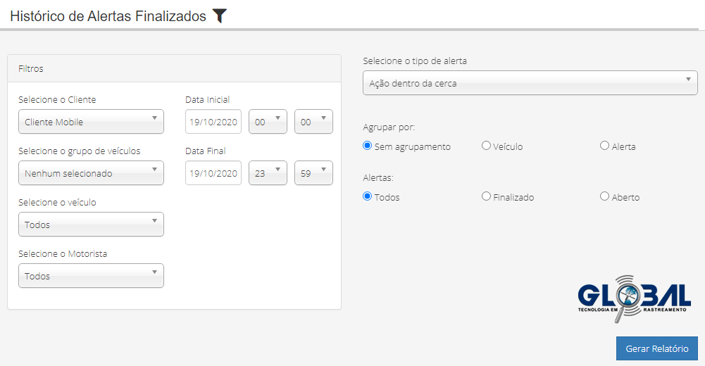 Na guia relatório de alertas, em filtros, defina os parâmetros (*Cliente, Grupo de veículos,* Veículo e Motorista, data, tipo de alerta e agrupamento) e clique em "Gerar Relatório". O relatório será executado em segundo plano.