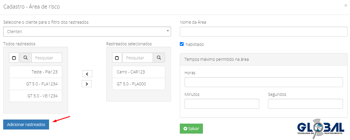 Após criar uma cerca, automaticamente, uma janela pop-up de Cadastro - Área de risco surgirá. Nela, preencha os dados do cliente, rastreados e tempo de permanência na área.