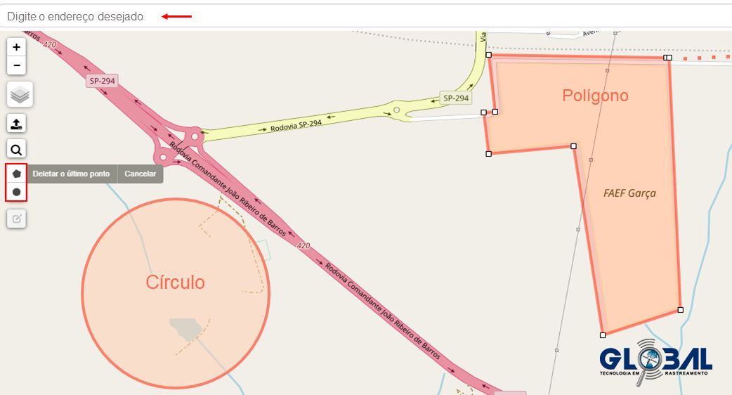 1- Digite um endereço base, desejado no campo de pesquisa, indicado na imagem a baixo.*Exemplo: País, Cidade, Rua e número → Brasil, Garça, Avenida Presidente Vargas, 70.