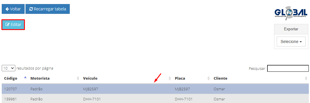 Nessa guia, realize o vínculo entre o motorista e o veículo (ativo) já cadastrados. Primeiro selecione o veículo na grid e clique no botão "Editar".