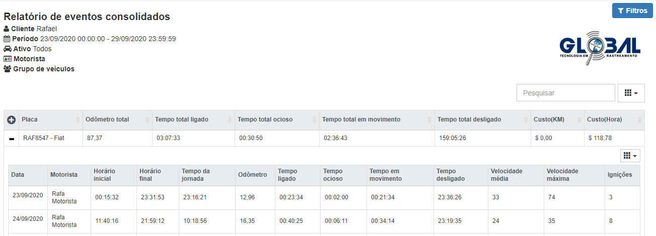 Nos relatórios de eventos consolidados visualize as condições do rastreado, como: odômetro, tempo ligado, tempo em movimento, ignição, média do consumo de combustível por km/litro, entre outros. Os relatórios são apresentados na plataforma web e podem ser exportados para os formatos PDF e CSV.