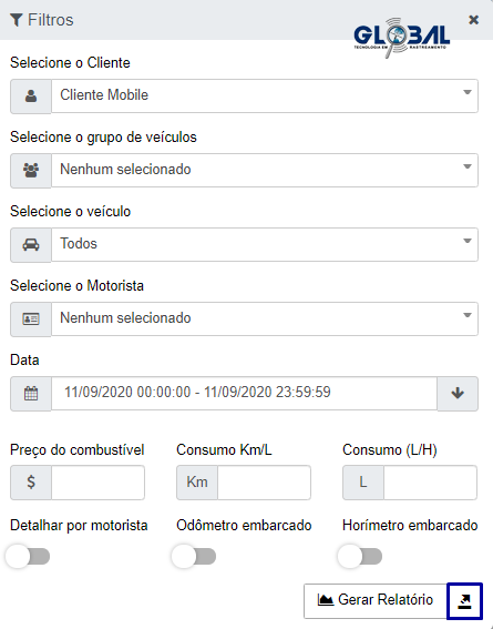 Na guia relatório de eventos consolidados, em filtros, defina seus parâmetros (*Cliente, Grupo de veículos,* Veículo e Motorista já cadastrados e ativos na Oficina, data, preço do combustível, consumos) e clique em "Gerar Relatório". O relatório será executado em segundo plano.