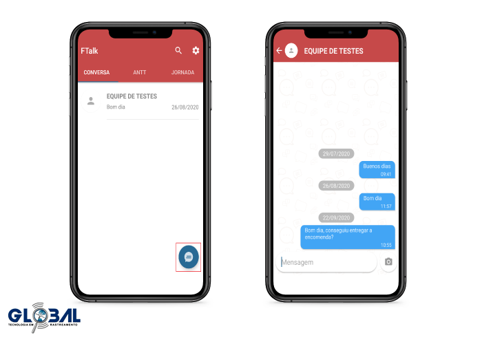 No chat do F/Talk, é possível interagir entre aplicativos e a plataforma do mesmo monitoramento. Para obter mais informações sobre a interação entre o aplicativo móvel e a plataforma web acesse a guia → Menu Principal → Mensagem.