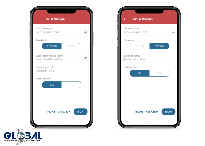 Para iniciar o monitoramento de uma viagem, no menu, o motorista deve clicar em “Iniciar Viagem”, selecionar um veículo, indicar se o tipo da será Viagem Regular (constante acontecimento) ou Viagem Fretada (viagem específica), e clicar no botão “Iniciar”.