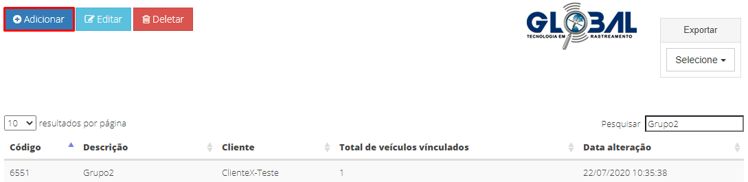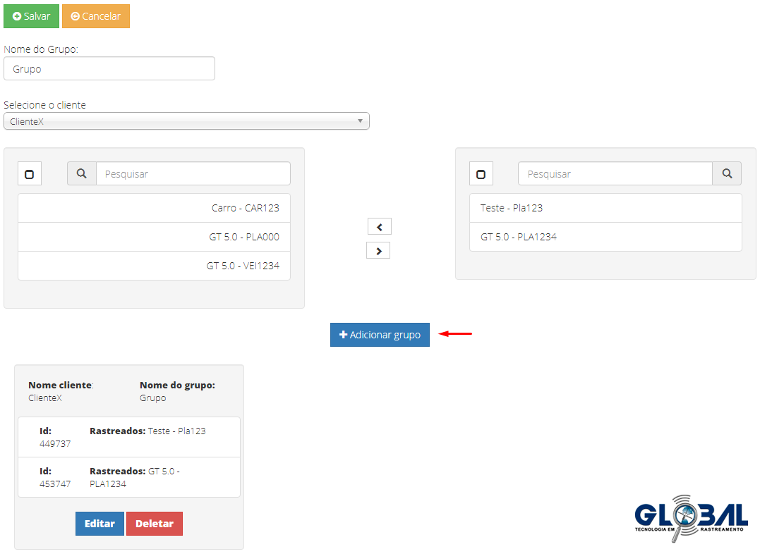 Após efetuar o Cadastro de Clientes e o Cadastro de Rastreados. Na guia de Cadastro de Grupo de Veículos cadastre um grupo com diversos ativos para clientes já existentes e monitorá-los de maneira simultânea. Além de editar, deletar e pesquisar grupos de veículos já existentes.