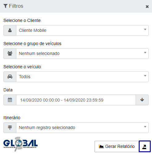 Na guia relatório cerca, em filtros, defina os parâmetros (*Cliente, Grupo de veículos, * Veículo, data, Cerca) e clique em "Gerar Relatório". O relatório será executado em segundo plano de acordo com a exportação desejada.