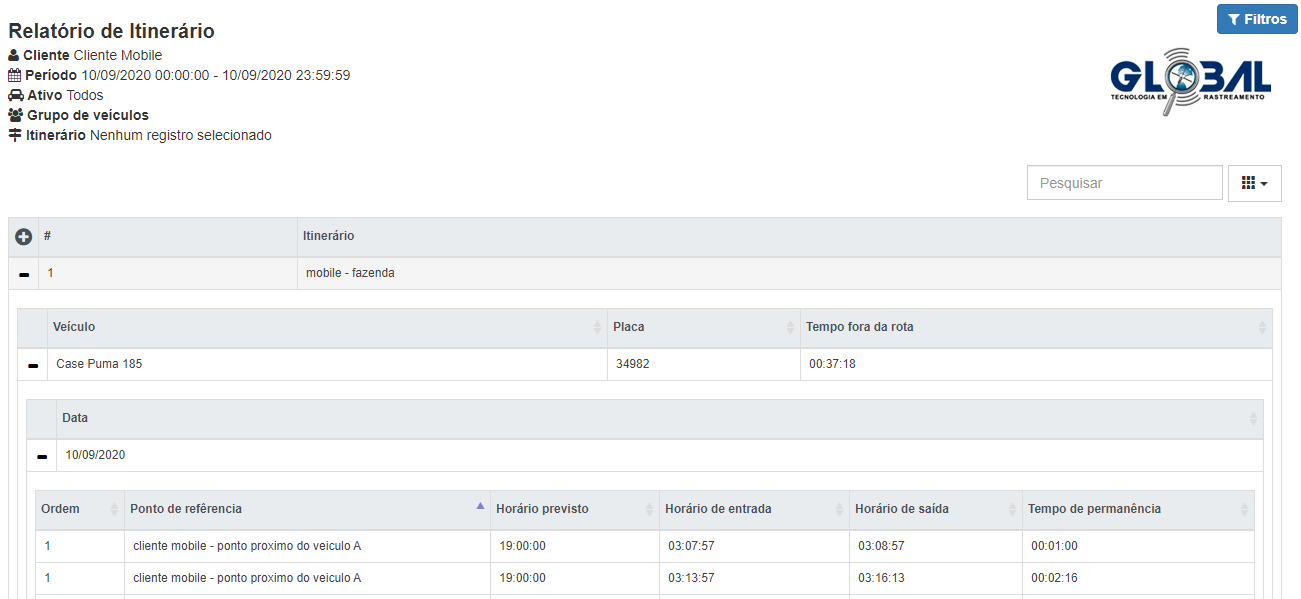 Nos Relatório de Itinerário visualize as informações dos ativos, coletadas remotamente pelos equipamentos com a tecnologia de gestão de frotas de um ativo, como: velocidade, distância percorrida, nível de combustível, temperatura do motor, entre outros. Os relatórios são apresentados na plataforma web e podem ser exportados para os formatos PDF e CSV