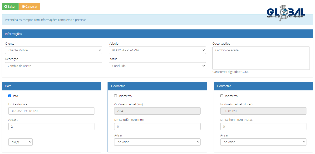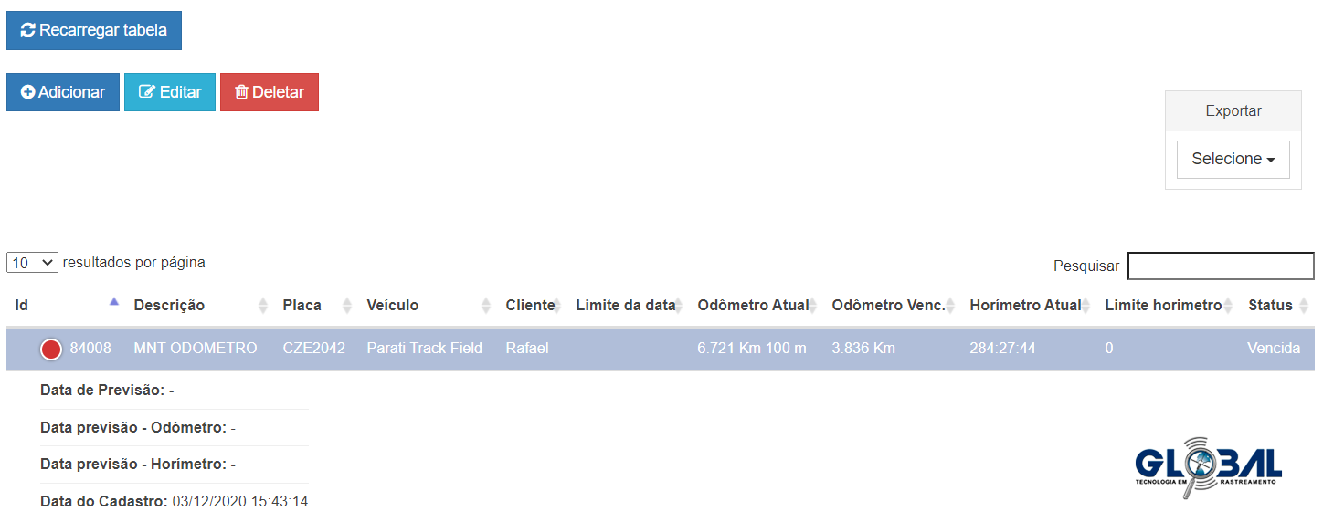 Na guia de cadastro de manutenção cadastre uma data para manutenção e agende avisos para os rastreados ativos e cadastrados no sistema. Também é possível editar, pesquisar, exportar e deletar avisos de manutenções já existentes.
