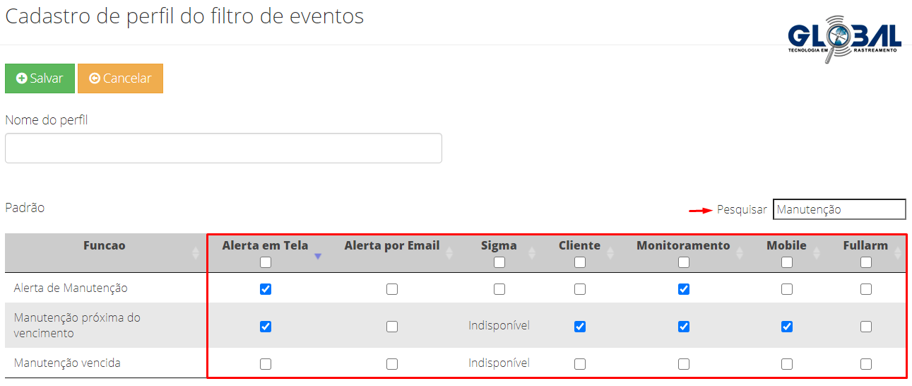 Após realizar o preenchimento sobre os dados da manutenção, para a ativação dos alertas de manutenção, acesse → Configurações → Cadastro de perfil → Perfil de Eventos. Pesquise "Manutenção" e habilite nas caixas das colunas os tipos de alertas desejados, como: Alerta em Tela, E-mail, Aplicativo F/Mobile, etc.