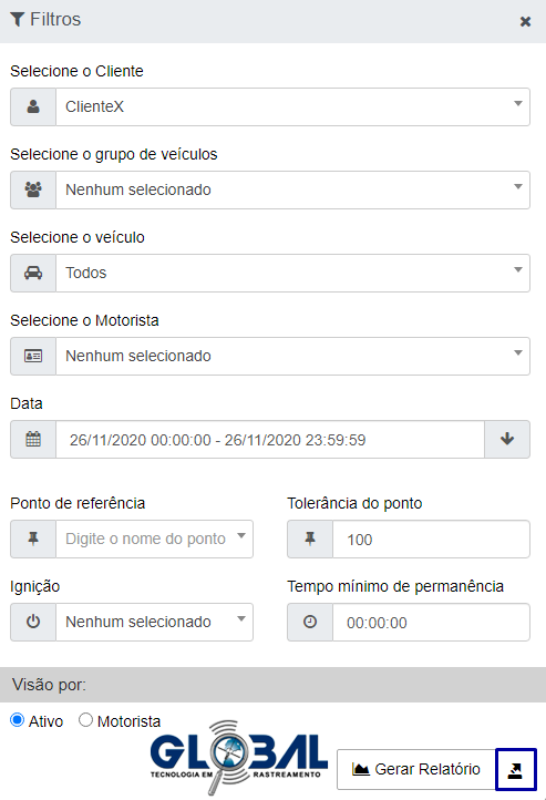 Na guia relatório de permanência, em filtros, defina os parâmetros (*Cliente, Grupo de veículos, *Veículo, Motorista, data, tolerância do ponto, Ponto de Referência, ignição, tempo mínimo de permanência) e clique em "Gerar Relatório". O relatório será executado em segundo plano.