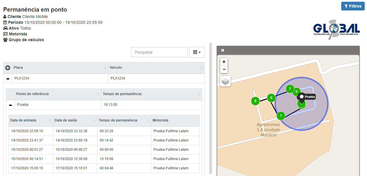 Nos relatórios de permanência em ponto visualize o tempo gasto dos ativos nos Pontos de Referência durante as rotas, data de entrada, data de saída, entre outros. Os relatórios são apresentados na plataforma web e podem ser exportados para os formatos PDF e CSV.