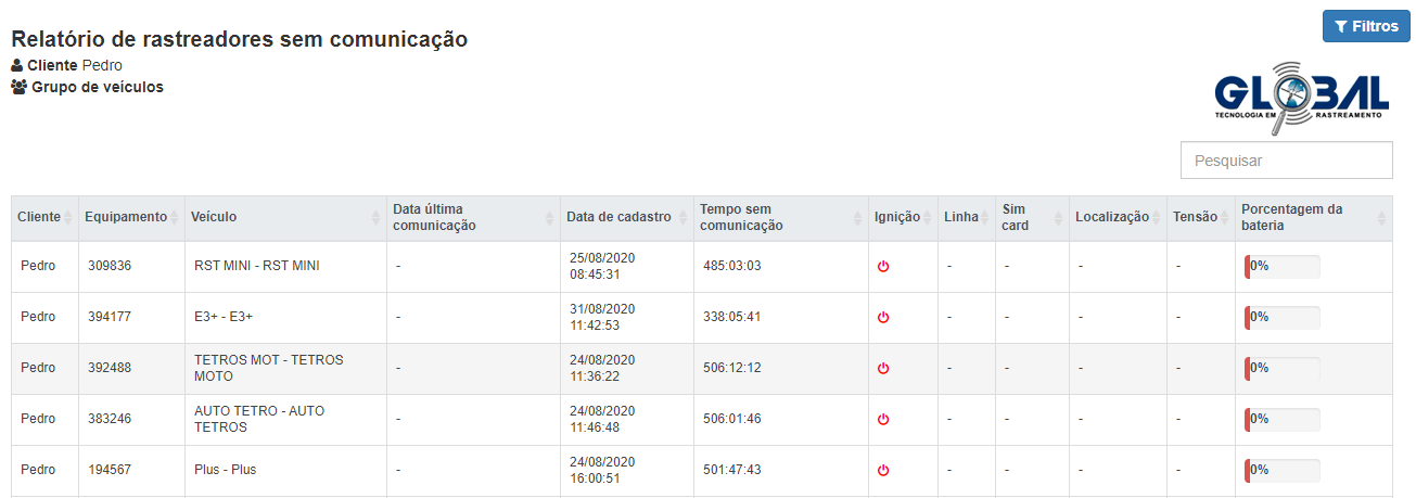 Relatório de rastreadores sem comunicação