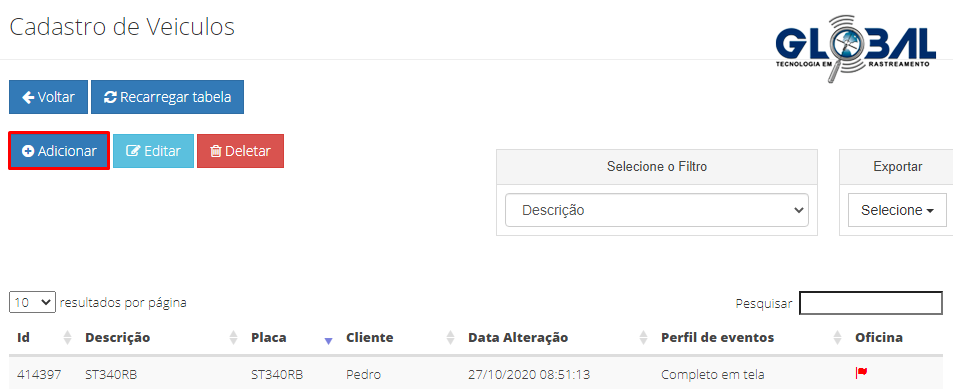 Na guia cadastro de rastreados, selecione a opção "Veículos", você será redirecionado para a guia de cadastro de veículos. Para cadastrar um novo Veículo, selecione a opção "Adicionar".