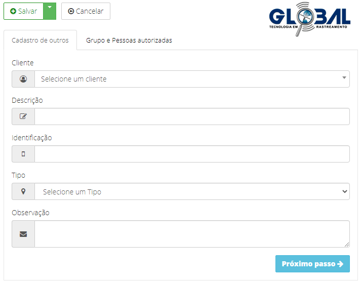 Na guia cadastro de outros, após clicar no botão "Adicionar", você será redirecionado para a aba cadastro de outros. Nela, preencha os parâmetros com as informações do rastreado e, opcionalmente, adicione uma observação. Observe a descrição das informações a seguir.