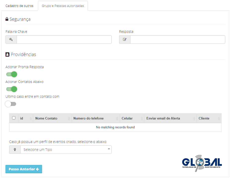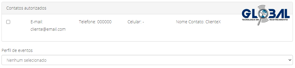 Na tabela de contatos autorizados, visualize e habilite os contatos vinculados com os veículos, para o envio de notificações e alertas quando necessários. Selecione também um Perfil de Eventos já existente.
