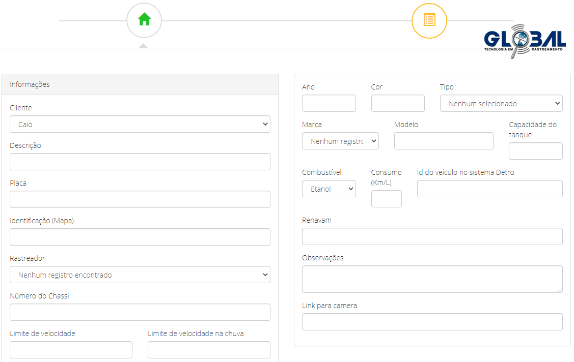 Na guia cadastro de veículos, após clicar no botão "Adicionar", você será redirecionado para a aba dados. Nela, preencha os parâmetros com as informações do veículo a ser rastreado e, opcionalmente, adicione uma observação. Observe a descrição das informações a seguir.