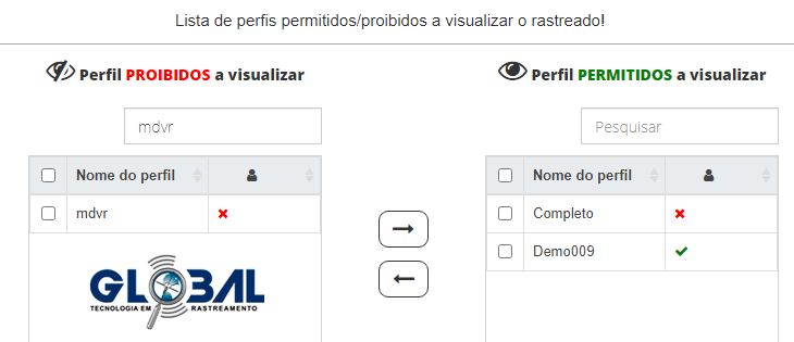 Após clicar em “Perfil”, uma janela pop-up surgirá. Nela, selecione e habilite os perfis proibidos e permitidos para visualização dos veículos.