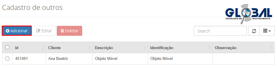 Na guia cadastro de rastreados, selecione a opção "Outros", você será redirecionado para a guia de cadastro de outros. Para cadastrar outro tipo de rastreado, selecione a opção "Adicionar".