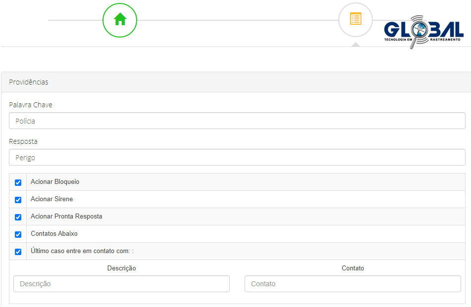 Após realizar o preenchimento dos dados. Na aba de opções, opcionalmente, por questões securitárias, preencha dos parâmetros das providências. Adicione uma Palavra-Chave e Resposta, para que caso a central de monitoramento seja adicionada através de alertas gerados a mesma poderá verificar de forma rápida quais providências deverão ser tomadas. Como, por exemplo: Acionar Bloqueio, Sirene, Pronta Resposta ou entrar em contato com uma pessoa cadastrada.