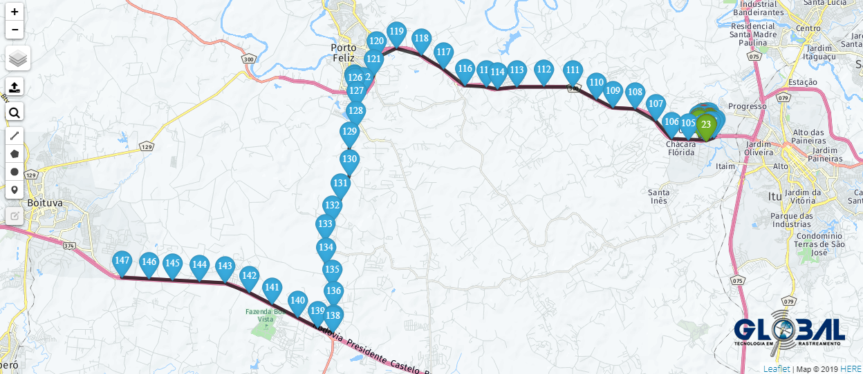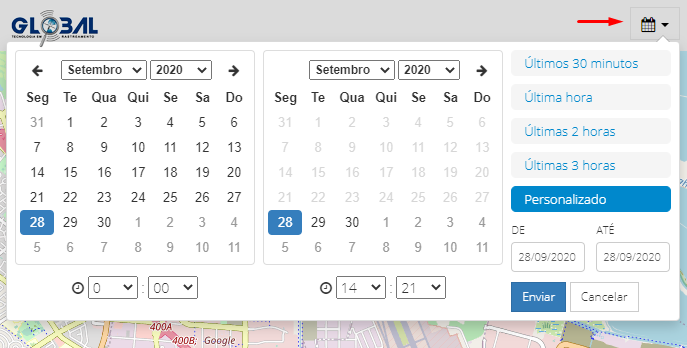 No Painel de Bordo, também é possível visualizar as Rotas do ativo. A Rota é um conjunto de pontos de verificação, cada um com uma determinada posição do ativo no mapa. Para visualizá-la clique no calendário indicado pela flecha na imagem anterior, defina os horários, dias, meses (intervalo máximo de 3 meses) e clique o botão "Enviar" para a exibição da rota no mapa..