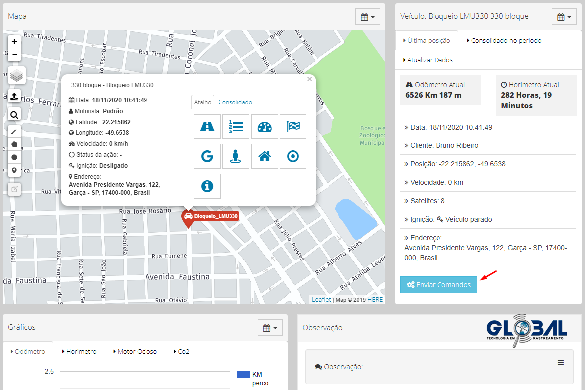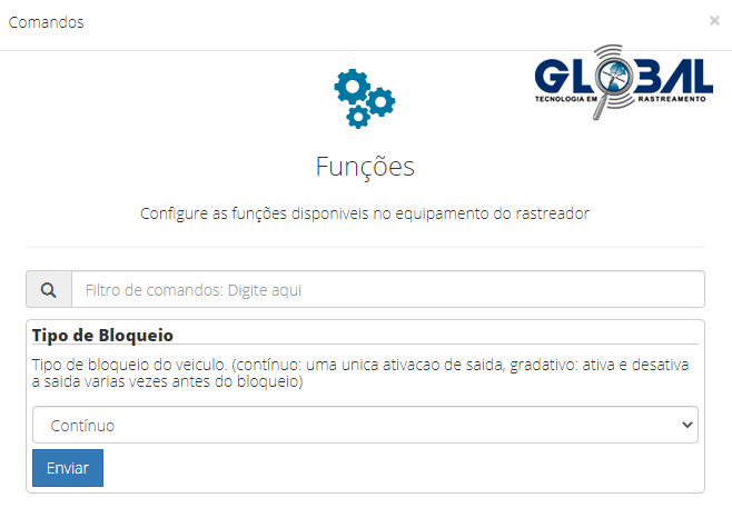 Para trabalhar com comandos, o serviço de comandos deve estar habilitada no Perfil do cliente final ou usuário do sistema. Na guia de Envio de comandos, configure e envie comandos para o ativo, como, por exemplo: bloqueio, desbloqueio, configurar. Um comando pode ser enviado manualmente de acordo com cada equipamento instalado no rastreado.