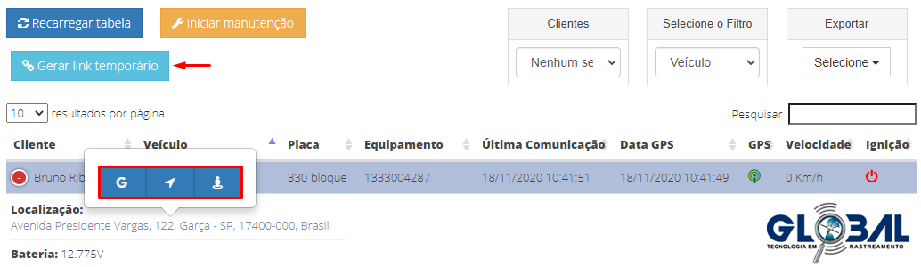 Na tela de rastreados, também é possível visualizar a localização do rastreado em vínculo ao Google Maps, Street View e o próprio mapa da plataforma web Gloabal Cianorte. Observe a seguir.