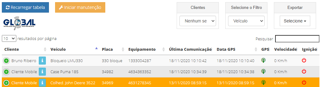 No rastreamento de veículos as posições dos rastreados podem ser acompanhadas em tempo real do seu servidor para outros servidores. Na guia de Rastreamento é possível visualizar em vários servidores e de forma simultânea os dados dos ativos rastreados como: cliente, veículo, placa, posições, sistema de ignição, bateria do rastreador e ser redirecionado para o Painel de bordo.