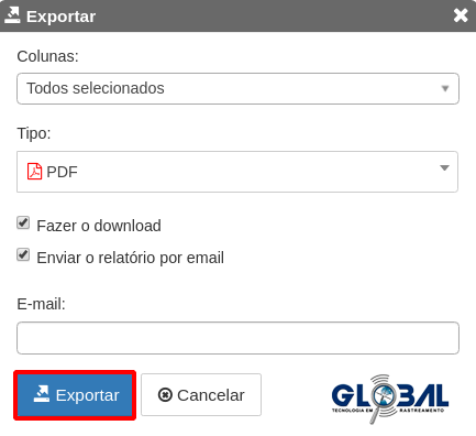 Na aba filtros, para obter o relatório como um arquivo, selecione o botão exportar, indicado em azul na imagem anterior, automaticamente, surgirá uma janela pop-up. Nela, defina os parâmetros descritos a seguir e clique em "Exportar".