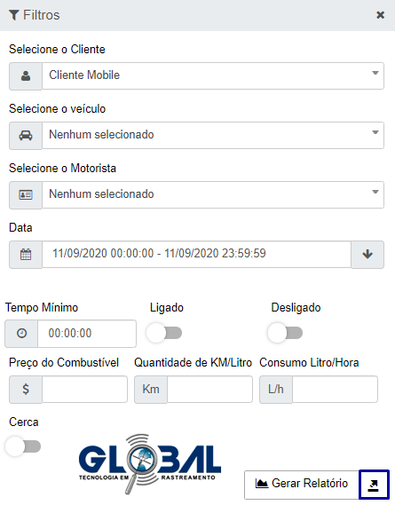 Na guia relatório de trajeto percorrido, em filtros, defina os parâmetros (*Cliente,* Veículo e Motorista, data, tempo, preço do combustível, consumo) e clique em "Gerar Relatório". O relatório será executado em segundo plano.