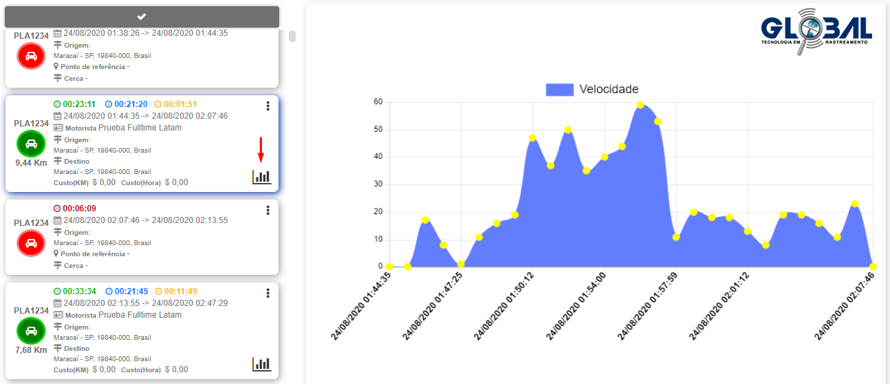 Selecione o gráfico indicado na imagem a seguir, para visualizar o gráfico com a velocidade aproximada em km/hora do rastreado durante os dias e horários percorridos.