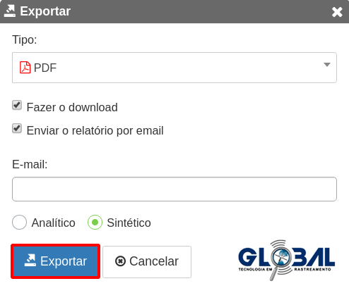 Na aba filtros, para obter o relatório como um arquivo, selecione o botão exportar, indicado em azul na imagem anterior, automaticamente, surgirá uma janela pop-up. Nela, defina os parâmetros descritos a seguir e clique em "Exportar".