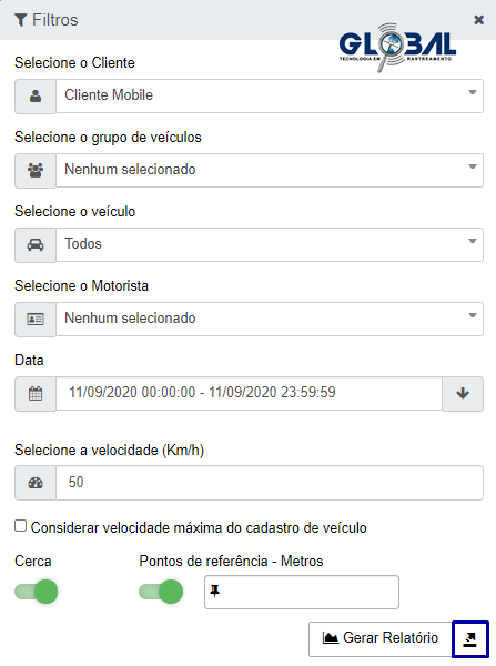 Na guia relatório de velocidade, em filtros, defina os parâmetros (*Cliente, Grupo de Veículos,* Veículo e Motorista, data, velocidade) e clique em "Gerar Relatório". O relatório será executado em segundo plano.