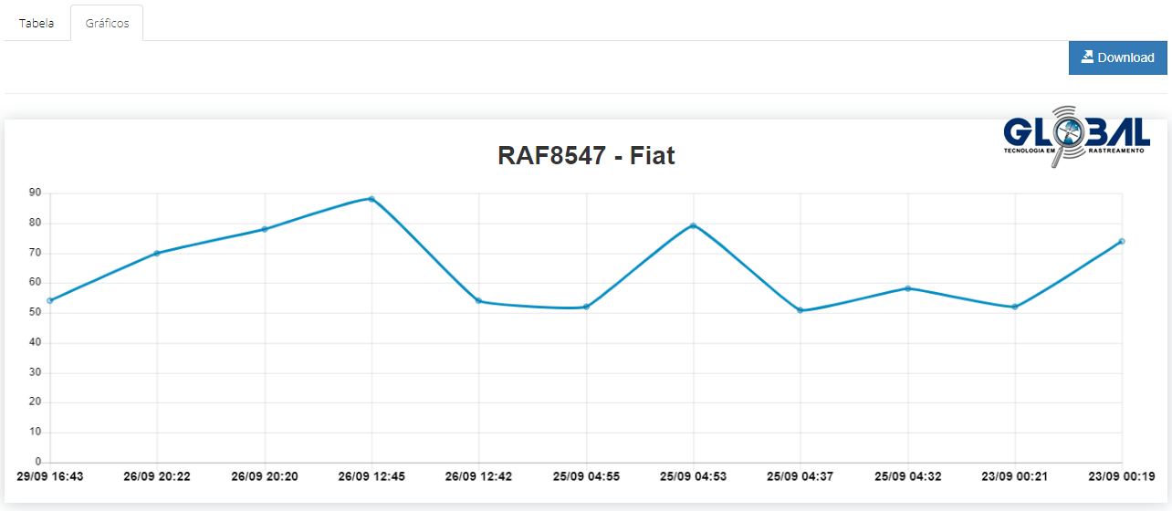 No relatório de velocidade, selecione a aba gráficos, para visualizar o gráfico com as velocidades atingidas do rastreado em relação às datas e horários trafegados. Clique em "Download" para baixar automaticamente o gráfico em formato PDF.