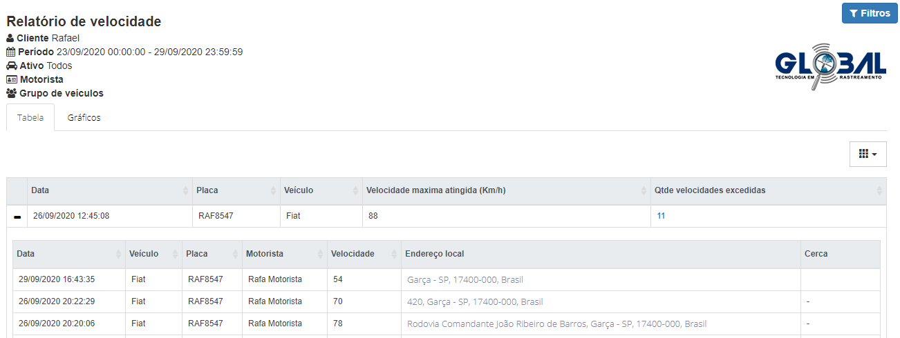 Na aba filtros, após selecionar "Gerar relatório", automaticamente, o relatório será carregado. Nele, visualize as informações sobre as velocidades dos rastreados do cliente selecionado.