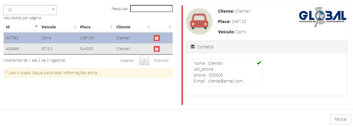 Após realizar o cadastro da Área de Risco, a tabela a seguir ficará visível. Nela, visualize os ativos cadastrados na nova área de risco e habilite os contatos existentes com um duplo clique no rastreado.