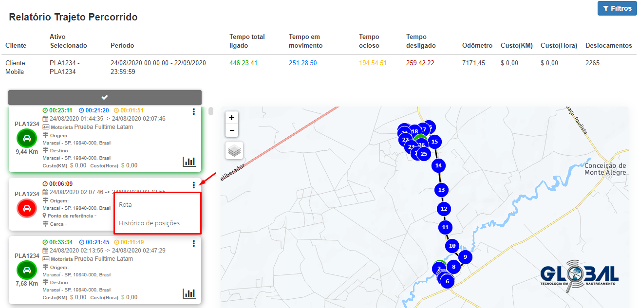 a aba filtros, após selecionar "Gerar relatório", automaticamente, o relatório será carregado. Nele, visualize as informações sobre o trajeto percorrido do rastreado do cliente selecionado. Também é possível o redirecionamento aos Relatórios de Rota e Histórico de Posições, por meio da seleção do botão indicado na imagem a seguir.
